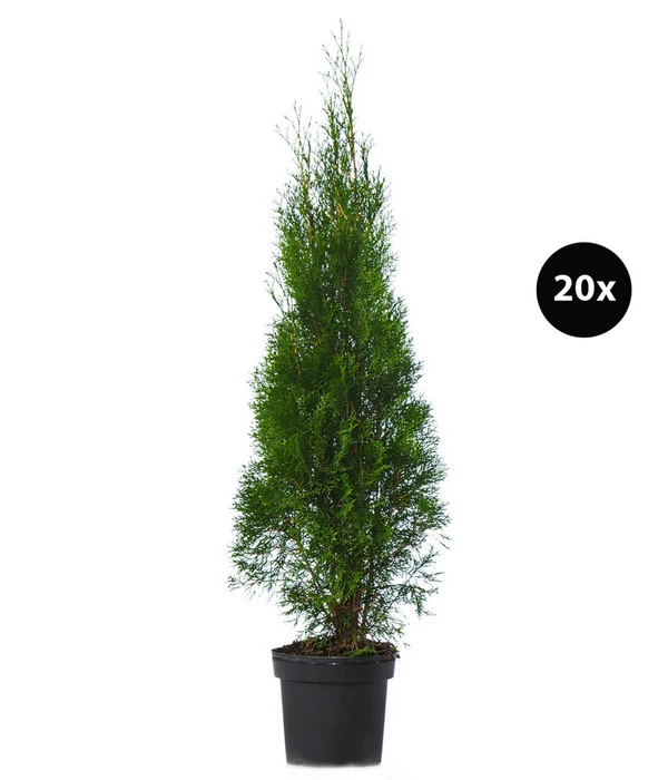Thuja-Pflanzen gehören zu den beliebtesten Gartenpflanzen und das ist kein Wunder. Denn erstens tragen sie ganzjährig ihr frischgrünes Nadelkleid und zweitens gehören sie zu den pflegeleichtesten Heckenpflanzen, für die Sie sich entscheiden können. Aber noch ein weiteres Merkmal trägt zu ihrer großen Beliebtheit bei: Die grünen Nadelgehölze erinnern ein wenig an die schlanken, hohen Zypressen, wie man sie rund ums Mittelmeer in den Gärten und Parks antrifft. Auch der Lebensbaum ‘Smaragd‘ zeigt neben dem Nadelkleid einen kegelförmigen, eher schlanken Wuchs, so dass Sie mit dieser Gartenpflanze ein wenig Mittelmeer-Feeling in Ihren Garten bringen. Die 20 kräftigen Pflanzen, die wir Ihnen hier im Paket anbieten, reichen aus für eine dichte 7 Meter lange Sichtschutzhecke. So lang muss Ihre Hecke nicht werden? Dann setzen Sie einfach einige Pflanzen Lebensbaum ‘Smaragd‘ als immergrüne Solisten und Strukturgeber in Ihre Gartenanlage!