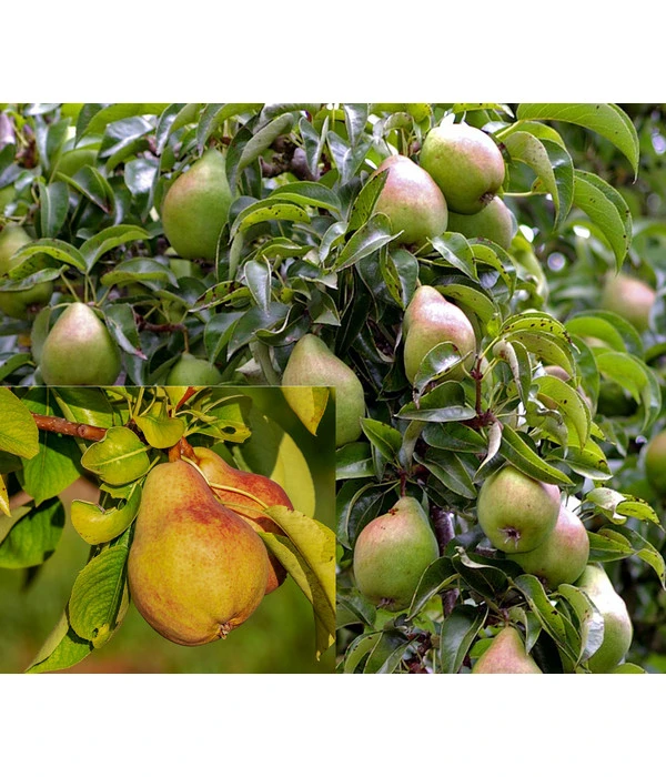 Birnen aus dem eigenen Garten – sieht nicht nur gut aus, schmeckt auch hervorragend. Mit dem Birnen-Duo ‚Clapps Liebling’/’Alexander Lucas‘ können Sie sich gleich zwei Birnensorten in den Garten holen, und zwar auf einem Baum. Überzeugen Sie sich jetzt vom Geschmack der beiden Sorte. ‚Clapps Liebling‘ hat große, hellgrüne, zartschmelzende Früchte, mit einem saftig, süßen Geschmack. Die Schale ist glatt, matt und hart. Die Früchte der Sorte ‚Alexander Lucas‘ sind auch groß, grüngelb und werden mit der Zeit leuchtend gelb. Die Frucht ist saftig, süß und sehr aromatisch. Mit diesen beiden Birnensorten haben Sie eine sehr lange Erntezeit, denn ‚Clapps Liebling‘ reift im August und ‚Alexander Lucas‘ im September. Letztere Sorte überzeugt durch ihre sehr gute Lagerfähigkeit, im Kühllager hält sie bis zu sechs Monaten. ‚Clapps Liebling‘ besitzt eine geringe Haltbarkeit. Beide Sorten bringen regelmäßige, hohe Erträge und sind recht robust. Ein Blütenmeer in weiß zeigt im Monat April.
