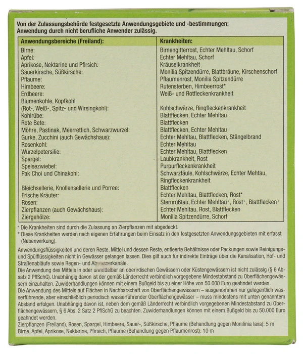 COMPO Duaxo® Universal Pilz-frei ist ein Breitband-Fungizid, mit dem Sie die meisten Pilzkrankheiten in Ihrem Garten bekämpfen können. Das Mittel wirkt gegen Birnengitterrost, Echten Mehltau, Schorf, Rost, Kräuselkrankheit, Blattflecken, Rotfleckenkrankheit, Weißfleckenkrankheit, Himbeerrost, Möhrenschwärze, Kohlschwärze, Ringfleckenkrankheit, Purpurfleckenkrankheit, Monilia laxa, Blattbräune, Kirschenschorf, Rostpilze und pilzliche Blattfleckenerreger.