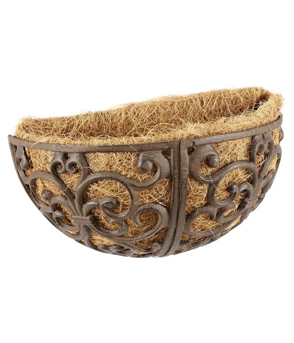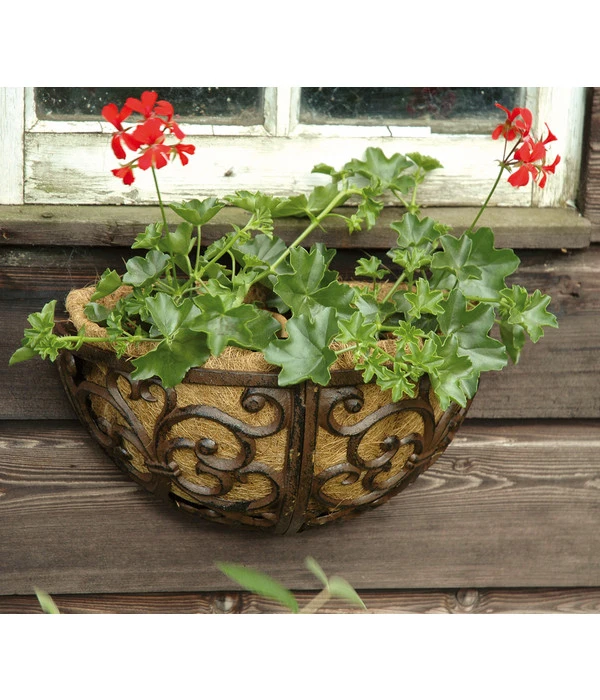 Ein nostalgischer Blumentopf zur Wandmontage, traditionell nach alter Handwerkskunst von Hand hergestellt. Mit seinem verschnörkelten Design und dem rostroten Farbton ist dieser Blumentopf eine dekorative Bereicherung für Ihre Terrasse und Ihren Balkon. Auf der Kokosmatte ( im Inhalt dabei ) finden Pflanzen ideale Bedingungen.