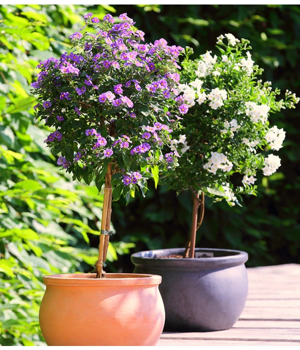 Der aus Südamerika stammende Enzianstrauch gehört, genauso wie die Kartoffel, zu der Familie der Nachtschattengewächse. Deshalb ist die Kübelpflanze hierzulande auch oftmals unter Namen Kartoffelstrauch bekannt. Seine sternförmigen Blüten erstrahlen in Weiß oder Blau-Violett und erfreuen das Auge von April bis Oktober mit unendlicher Blütenpracht. Als Stämmchen gezüchtet, verzaubert der Enzianstrauch jeden Sitzplatz auf Balkon oder Terrasse, auch im Garten verzaubert er zwischen dunklen Gehölzen. Unsere kalten Wintertemperaturen gefallen dem Enzianstrauch allerdings nicht, weshalb man ihn zur kalten Jahreszeit frostfrei überwintern sollte.
