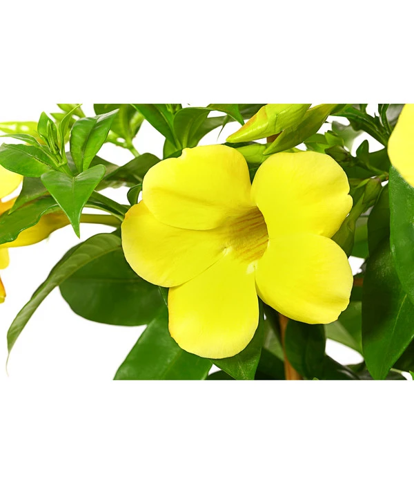 Ihre Fans sind sich einig: Die Goldtrompete ist eine der schönsten Kletterpflanzen und macht der bekannteren Dipladenie, der sie ein wenig ähnelt, echte Konkurrenz. Im Gegensatz zur Dipladenie schmückt sich die Allamanda cathartica mit sonnengelben, trompetenartigen Blüten, die im Sommer über dem glänzenden, sattgrünen Laub leuchten. Was muss das erst für ein fantastischer Anblick sein, wenn man die Pflanze am Naturstandort in den undurchdringlichen Regenwäldern Brasilien entdeckt, wo die zahlreichen Blüten in dem Halbdunkel besonders hell leuchten! Aber auch in unseren Wohnungen hier in Mitteleuropa ist die Goldtrompete ein Blickmagnet im Raum. Vor allem, weil sie nicht nur eine ungebremste Blühfreude zeigt, sondern auch vor Wachstumsenergie nur so sprüht und in Windeseile an einem Spalier oder einer anderen Kletterhilfe bis in Höhen von 200 cm klettert. Gönnen auch Sie sich den Anblick dieser traumhaft schönen Tropenpflanze, die auch unter dem Namen Dschungelglocke bekannt ist.