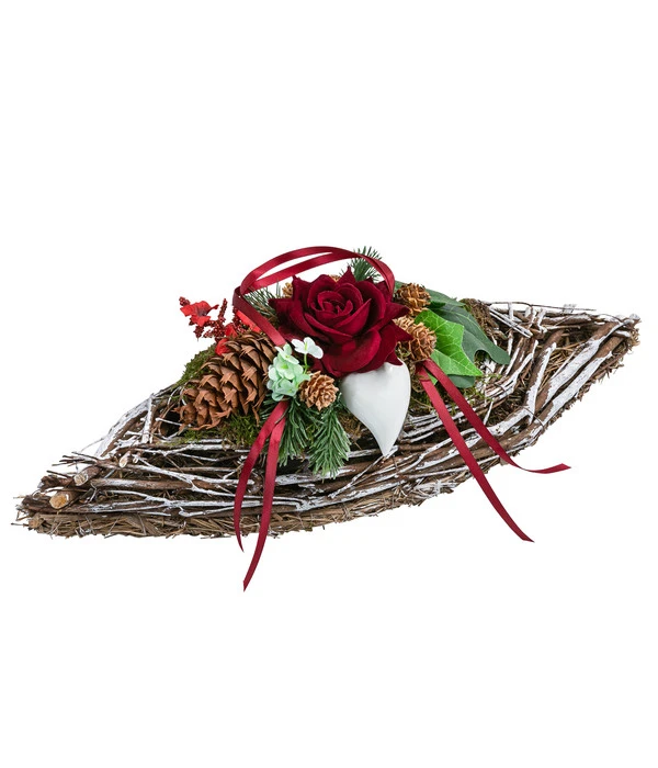 Ist es für Sie auch ein wichtiges Anliegen, Ihren Verstorbenen eine besondere Ehre zu erweisen? Dann entdecken Sie jetzt das zauberhafte Grabgesteck Bristol aus dem Hause Dehner. Dieses liebevoll gestaltete Gesteck ist mehr als nur eine Dekoration – es ist eine berührende Erinnerung an Ihre Lieben, die Ihnen am Herzen liegen. Die Unterlage für dieses Arrangement wurde von erfahrenen Floristen aus geweißten Rebenzweigen von Hand gefertigt und kunstvoll mit einer leuchtend roten Seidenrose gekrönt. Das kleine Keramikherz verleiht dem Gesteck eine elegante und liebevolle Note, während die farblich passenden Bänder die Kreation harmonisch abrunden.