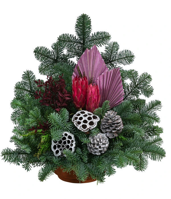 Sind die goldenen Herbsttage vorbei und der November steht vor der Tür, ist es in vielen Familien Brauch, die Gräber der Lieben für Allerheiligen und Totensonntag festlich zu schmücken und so die Verstorbenen zu ehren. Dabei wird Wert darauf gelegt, dass der Grabschmuck nicht nur wenige Tage gut aussieht, sondern das Grab möglichst viele Wochen ziert. Diesem Wunsch sind unsere Floristen nachgekommen und haben mit diesem Grabgesteck ein Arrangement kreiert, das stilvolles Design mit langer Haltbarkeit vereint. Die tragende Rolle in dieser Komposition spielen die kräftigen, immergrünen Zweige der edlen Nobilistanne, die mit dekorativer Optik bei bester Nadelfestigkeit überzeugt. Ideale Voraussetzungen also, dass dieses Grabgesteck herbstlichen Dauerregen wie frostiges Winterwetter gut übersteht und bis in den Frühling hinein attraktiv wirkt. Die aufrecht arrangierten Zweige wurden üppig mit verschiedenen Naturmaterialien geschmückt, die das Grabgesteck zu einem repräsentativen Grabschmuck machen, der mit seiner Höhe von 50 cm ideal für größere Gräber und Familien-Grabstätten ist.