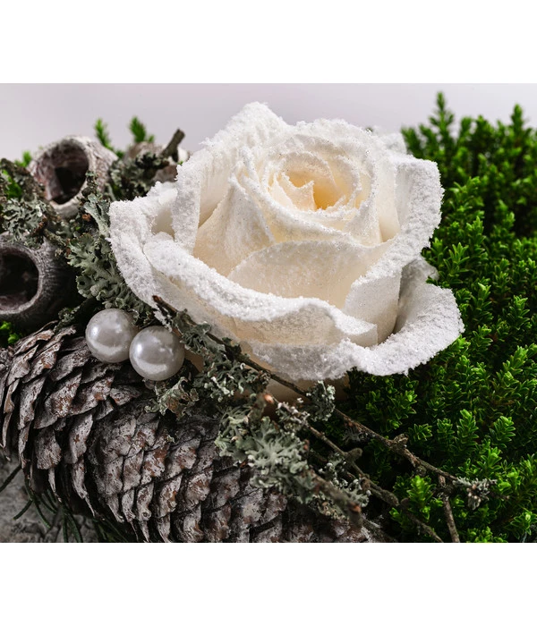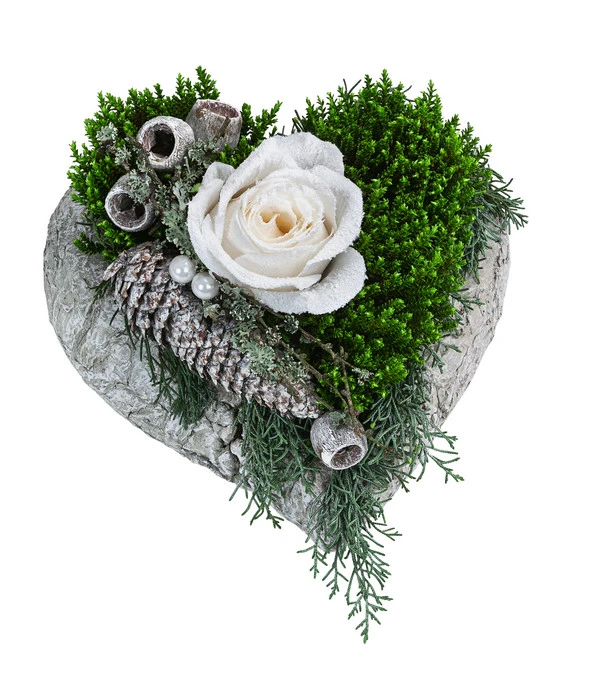 Grabschmuck muss nicht riesig sein, um die letzte Ruhestätte eines lieben Menschen stilvoll zu schmücken und den Verstorbenen dadurch zu ehren. Mit dem Grabgesteck Stille können wir Ihnen eine Kreation vorstellen, die klein, aber oho ist. Und mit der Sie auch ohne Worte Ihre Gefühle für den Verstorbenen ausdrücken können. Denn die Schale zeigt die beliebte Herzform, eines der schönsten und bekanntesten Symbole für die Liebe. Bepflanzt wurde die Schale mit einem reizvollen Potpourri aus Strauchveronika, Koniferenzweigen und Fichtenzapfen, alles Naturmaterialien, die lange halten und das Grab bis ins Frühjahr schmücken. Das Schönste am Grabgesteck Stille aber ist die prachtvolle, weiße Rosenblüte, die nie verwelken wird und als Symbol für die Liebe zu einem anderen Menschen gilt, die auch der Tod nicht trennen kann. Entscheiden Sie sich in diesem Jahr für das Grabgesteck Stille, das besonders für kleine Grabstätten und Urnengräber geeignet ist.
