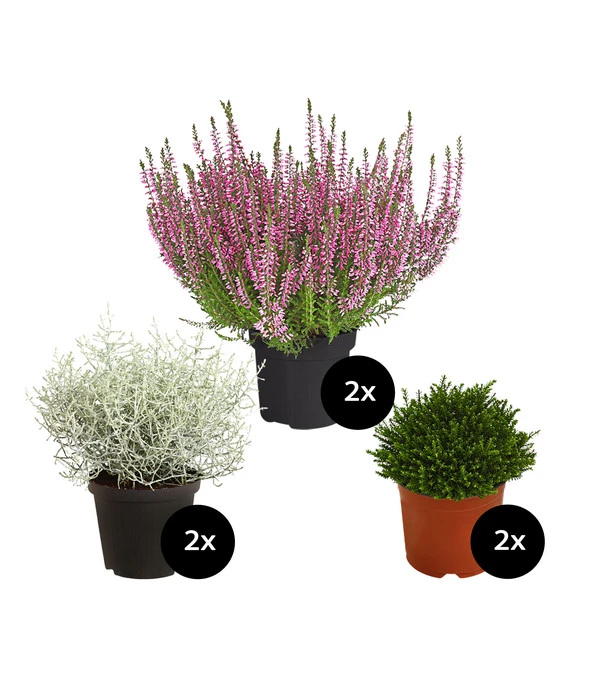 Ein geliebter Verstorbener bleibt auf ewig in unserem Herzen – mit allen schönen Erinnerungen, denen wir bei unseren Besuchen am liebevoll gepflegten Grab in aller Ruhe nachgehen können. Deshalb wollen Sie für den Herbst mit dem Grabpflanzenset Zeitlos eine attraktive, saisonal passende Bepflanzung anlegen. Die enthaltenen Pflanzen wurden mit viel Feingefühl zusammengestellt und bieten einen Mix aus dezentem, immergrünem Blattschmuck und einem geschmackvollen Farbakzent: je 2 x Gitterkraut, Knospenheide und Strauchveronika ‚Green Globe‘. Das Gitterkraut bietet mit seinem bizarr geformten Blattwerk und dem edlen Silberton einen reizvollen Anblick, während die Strauchveronika ‚Green Globe‘ als sattgrünes Kissen die Blicke auf sich zieht. Die Knospenheide, ein dekorativer Klassiker, ist der farbige Blickfang des Sets. Sie bezaubert den Betrachter mit ihren unzähligen kleinen, rosafarbenen Blüten. Und das die gesamte kalte Jahreszeit hindurch. Ob Sie damit ein ganzes Grab-Beet neu bepflanzen oder den Pflanzbereich um Ihre saisonal wechselnden Gestecke herum gestalten wollen – mit dem Grabpflanzenset Zeitlos wird Ihnen alles gelingen, greifen Sie einfach schnell zu!