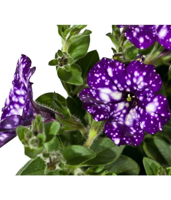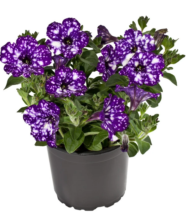 Na, wäre das nicht ein traumhafter Schmuck für Ihren Balkon? Auf den kräftig violetten Blüten erstrahlen die weißen Tupfen wie funkelnde Sterne am Nachthimmel – ein prachtvoller Anblick, der Sie bestimmt an Urlaub und entspannte Sommerabende unter dem südlichen Sternenhimmel erinnert. Die Hängepetunie ‚Night Sky‘ ist eine bei Tag wie bei Nacht strahlende Schönheit, die die Atmosphäre auf Ihrem Balkon verzaubern wird. Noch ein Tipp zur Bepflanzung Ihrer Balkonkästen: Besonders eindrucksvoll ist die Wirkung, wenn Sie Petunien-Sorten mit unterschiedlichen Blütenfarben und -formen mixen. Zu den blau-weißen Blüten der Hängepetunie ‚Night Sky‘ lassen sich zum Beispiel ausgezeichnet reinweiße, gelbe oder pinkfarbene Petunien kombinieren.