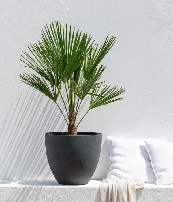 Exotische Schönheiten müssen keine Mimosen sein. Mit der Chinesischen Hanfpalme können wir Ihnen eine der robustesten und frosthärtesten Palmen weltweit vorstellen. Heimisch ist die Chinesische Hanfpalme vom Himalaya im Norden Indiens bis Nordthailand und China. In Europa begegnet man ihr oft in mediterranen Gärten, in Meran, dem Gardasee, im Tessin und in Südengland. Je nach Region kann diese Palmenschönheit auch bei uns auf reizvolle Weise Gärten und Terrassen mit ihrem exotischen Flair verzaubern. Mit ihrer charakteristischen Optik – den fächerartigen Blättern, die vom Kopf aus nach oben austreiben und sich im zunehmenden Alter senken – braucht sie ausreichend Platz, um sich gut entfalten zu können. Sie kann in Kübeln kultiviert, in milden Regionen aber auch in den Garten gepflanzt werden.