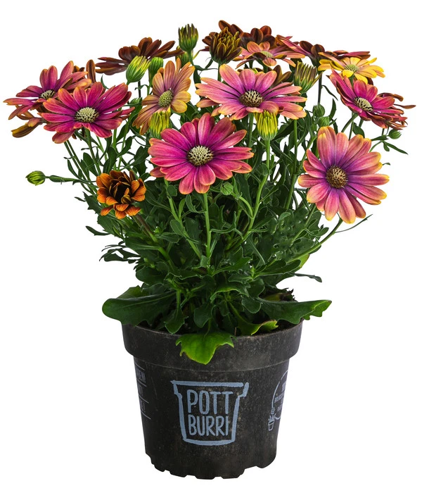 Wenn eine Pflanze leuchtende Blüten präsentiert, die das Auge erfreuen, ist das schon ein tolles Geschenk der Natur. Wenn die Pflanze uns diesen strahlenden Anblick den ganzen Sommer schenkt, ist das ein besonderer Glücksfall. Neben Geranien und Petunien gehören die in dem südlichen Afrika beheimateten Kapkörbchen zu den beliebtesten Beet- und Balkonpflanzen, denn ihre unermüdliche Blühfreude manifestiert sich in wunderschönen, margeritenähnlichen Blüten, die von Mai bis September über dem buschig grünen Laub leuchten. Sie kennen diese beliebte Blühpflanze bereits? Aber vielleicht kennen Sie noch nicht das Kapkörbchen im Pottburri®-Topf, denn das ist eine echte Neuheit! Denn dieser Topf ist nicht aus Plastik, sondern biologisch abbaubar. Genießen Sie jetzt eine ganz neue, umweltfreundliche Art des Gärtnerns und holen Sie sich gleich viele prachtvoll blühenden Kapkörbchen im Pottburri®-Topf!