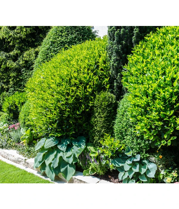 Der Kirschlorbeer-Strauch ist auch ein Schmuckstück für Gruppenpflanzung im Garten, zum Beispiel mit hübschen Blühsträuchern. Aber auch in einem großen Kübel ist der Kirschlorbeer eine Schau auf der Terrasse. Da er so schnittverträglich ist und nichts übel nimmt, können Sie sogar Ihre Formschnittkünste an ihm ausprobieren und den Kirschlorbeer zum Beispiel als Riesenkugel oder als Kegel schneiden. Was andere mit kleinen Buchs-Büschen machen, gelingt Ihnen im Großen mit einem Kirschlorbeer!