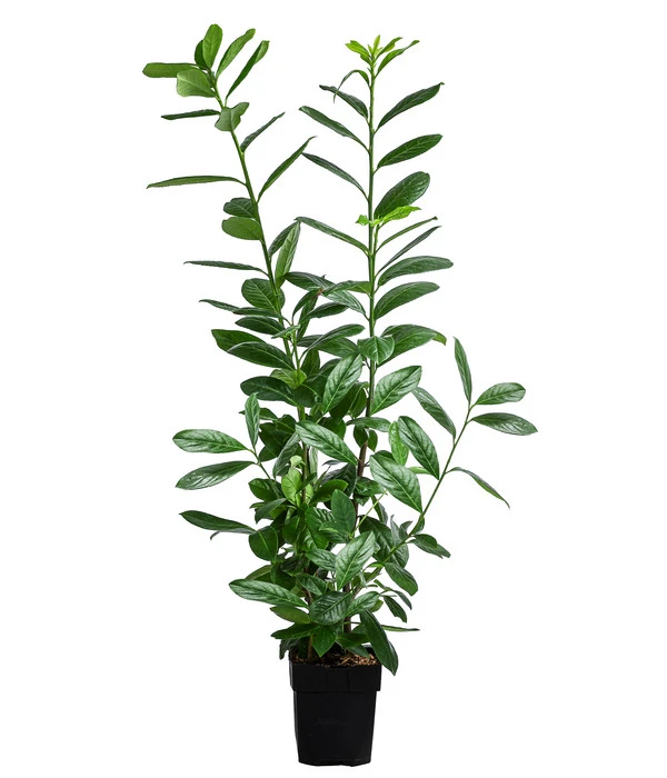 Er präsentiert sich im Schmuck von zunächst hellgrünen und später glänzend dunkelgrünen Blättern wie ein „echter“ Laubbaum, wirft seine Blätter aber im Herbst nicht ab, sondern zeigt sich den ganzen Winter über in seinem hübschen grünen Kleid. Für alle, die eine dichte, immergrüne Hecke möchten, aber kein Freund von Koniferen sind, ist der Kirschlorbeer eine wunderschöne Alternative. Und abgesehen von seiner attraktiven Optik verfügt dieses unkomplizierte Laubgehölz noch über einige andere Vorzüge. So ist er extrem schnellwüchsig und kann unter idealen Standortbedingungen 30 bis 40 cm pro Jahr zulegen. Der Wuchs ist wunderschön buschig, so dass Sie für eine dichte Hecke auch nicht viele Kirschlorbeer-Pflanzen pro Meter brauchen. Und obwohl er immergrün ist, sorgt das Laubgehölz im Laufe des Jahres trotzdem für optische Abwechslung: Im Mai und Juni strahlen hübsche weiße Blütenrispen zwischen dem grünen Blattwerk, die zudem noch herrlich duften; im Herbst schmücken kirschgroße, schwarze Früchten die Zweige. Aber Vorsicht: Die Früchte sind nicht zum Verzehr geeignet.