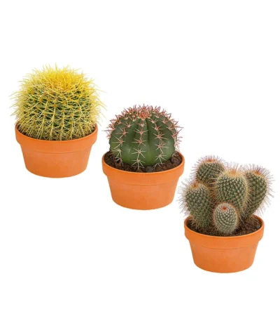 Sie sind fasziniert von der Welt der Kugelkakteen und deren unglaublicher Bandbreite? Dann wird Sie dieser Kugelkaktus Mix interessieren. Denn er bietet vom Ferokaktus über den Schwiegermuttersessel bis hin zum Warzenkaktus die unterschiedlichsten Ausprägungen der stacheligen Gesellen. Und sie sind alle echte Hingucker für Ihre sonnigste Fensterbank! Ganz gleich also, ob es ein Ferokaktus ist, der mit seinen roten oder gelben Stacheln auf ausgeprägten Rippen furchteinflößend imposant wirkt; oder der berühmte, reichlich bewehrte Schwiegermutterstuhl, der seinen Namen der Ähnlichkeit zu einem Polsterhocker verdankt; oder ob sich ein Warzenkaktus bei Ihnen heimisch fühlen möchte, der mit seinen vielen kleinen Stachelkugeln wirklich witzig wirkt. Dieser Mix ist der Hit! Greifen Sie also nach Lust und Laune zu und lassen Sie den Kugelkaktus Mix bei sich einziehen!