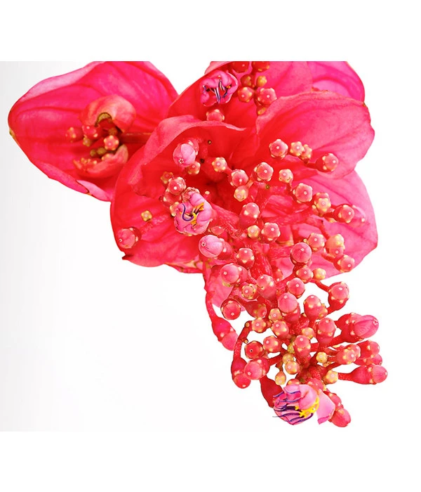 Es gibt viele aus den tropischen Regenwäldern stammende Pflanzen, die in unseren Häusern ein neues Zuhause gefunden haben. Hier können wir Ihnen eine der prächtigsten vorstellen: die Medinille ‘Flamenco‘. Auf den Inseln im Indischen Ozean wachsen über 100 Medinilla-Arten, kultiviert wird aber nur die Medinilla magnifica, die von den Philippinen stammt. Die Medinille ‘Flamenco‘ ist eine neue Züchtung mit Blüten, die so atemberaubend sind wie die leuchtenden Kostüme der Flamencotänzerinnen. Unzählige rosarote Einzelblüten hängen an bis zu 40 cm langen Blütenrispen, die von dekorativ rot bis rosafarbenen Deckblättern geschützt werden. Wenn die Blütezeit beginnt, richten sich die Deckblätter auf und geben den Blick frei auf die einzelnen Blütenglocken. Ein immer wieder faszinierendes Schauspiel, das bis zu 2 Monate andauern kann. Dicke, ledrige Blätter bilden den ruhigen Hintergrund für dieses Farbenspektakel, das mit jedem Jahr beeindruckender wird, denn die Pflanze kann ein bis zu 2 m hoher Strauch werden.