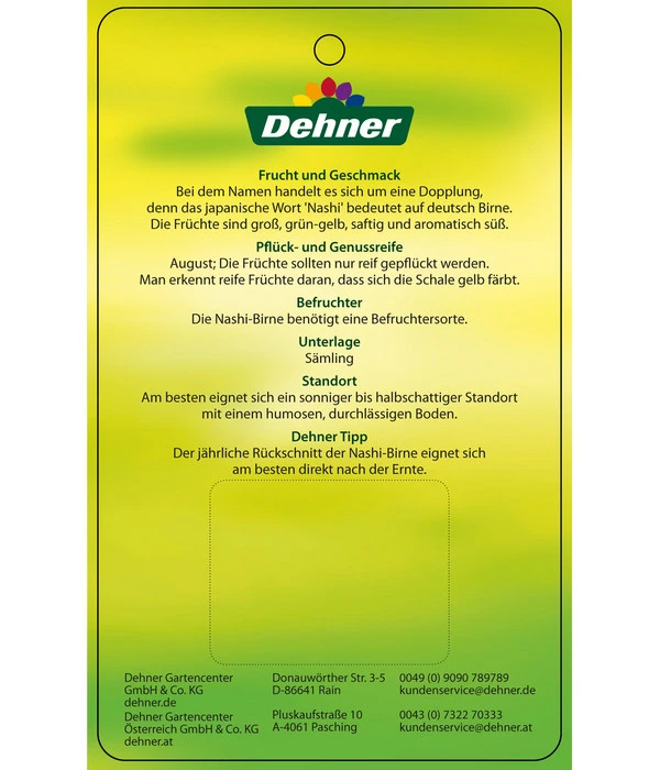 Die Nashi-Birne ‘Nijiseiki‘ bevorzugt einen sonnigen, geschützten Standort mit einem humosen, nährstoffreichen Boden, der nicht zu kalkhaltig sein sollte. Wenn Sie den Obstbaum im Frühjahr pflanzen, sollten Sie ihn den ganzen Sommer regelmäßig gießen. Gut eingewurzelte Pflanzen benötigen nur bei extremer Trockenheit zusätzliche Wassergaben. Im Februar/März wird den Baum regelmäßig zurückgeschnitten. Für die Befruchtung sorgt eine zweite Nashi-Sorte oder aber ein Birnbaum, wie z.B. die Sorte ‚Willams Christ‘.