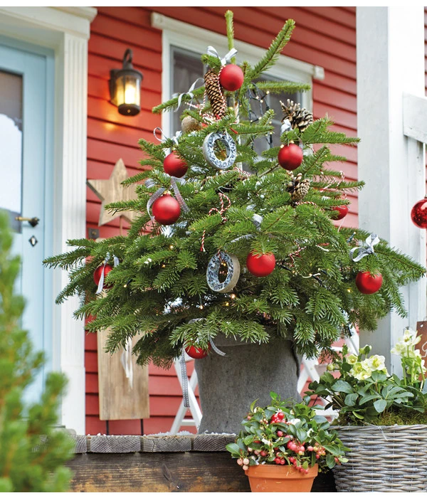 Goldene Lichter und farbenfroher Schmuck auf dunkelgrünen Zweigen – ein Weihnachtsbaum ist für viele das A und O für ein gelungenes Fest. Und die berühmte Nordmann-Tanne ist einer der prächtigsten Weihnachtsbäume, für die Sie sich entscheiden können. Sein pyramidaler Wuchs mit den dichten Zweigen und den dunkelgrünen Nadeln ist schon ohne Schmuck ein Hingucker, seine gleichmäßig angeordneten Äste laden Sie aber dazu ein, Ihren schönsten Baumschmuck daran zu hängen. Und während Sie den Baum schmücken, werden Sie noch einen weiteren Vorzug der Nordmann-Tanne entdecken: Die festen Nadeln sind angenehm weich, so dass Sie sich nicht daran stechen. Allerdings haben Sie es immer bedauert, den schönen Baum nach dem Fest wegwerfen zu müssen? Dann machen Sie es in diesem Jahr wie viele andere Weihnachtsbaum-Liebhaber: Nehmen Sie eine Nordmann-Tanne, die im Topf gewachsen ist und pflanzen Sie das vitale Gehölz nach den Festtagen in den Garten! Dann haben Sie im nächsten Jahr zusätzlich einen prachtvollen Weihnachtsbaum im Garten, den Sie mit einer Outdoor-Lichterkette zum Strahlen bringen können.