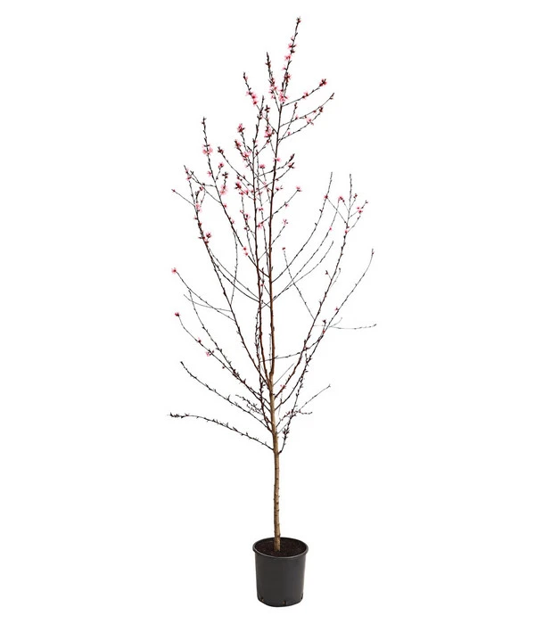 Der Pfirsich ‘Rubira‘ wird von manchen auch Blutpfirsich genannt, denn als erstes wird unser Blick natürlich von dem dunkelroten Laub angezogen, das dem eines Ziergehölzes ebenbürtig ist und im Garten einen dekorativen Farbakzent setzt. Auch zur Blütezeit im Frühjahr wird der Pfirsich ‘Rubira‘ zum bewunderten Hingucker im Garten werden, wenn die Äste über und über mit rosafarbenen Blüten bedeckt sind. Und fesselte das attraktive Gehölz vom Frühling bis zum Sommer vor allem die Liebhaber optisch interessanter Pflanzen, so gesellen sich im Spätsommer noch die Obst-Gourmets hinzu. Denn Eingeweihte wissen, dass der Pfirsich ‘Rubira‘ kein Ziergehölz ist, sondern eine seltene Pfirsichsorte, die im Herbst wunderbar süß-aromatische Früchte trägt. Die außen ebenfalls rötlichen, innen grünlichen Pfirsiche können roh verzehrt oder zu verschiedenen Fruchtspeisen verarbeitet werden.