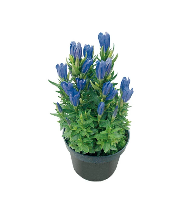 Wie oft ist die Pflanze mit den intensiv blauen Blüten schon bewundert und besungen worden! Und wir prophezeien Ihnen: Schauen Sie tief in die leuchtenden Glockenblüten des Enzians und auch Sie werden Ihr Herz auf der Stelle verlieren! Diese Enzianstaude hat aber noch eine weitere Besonderheit zu bieten und das ist der aufrechte, pyramidenartige Wuchs, der bis in eine Höhe von 25 cm reicht. Wer neben Edelweiß an Enzian als DIE typische, einheimische Gebirgsblume denkt, hat nur halb Recht. Enzian-Gewächse sind in den Gebirgsregionen auf der gesamten gemäßigten Nordhalbkugel zu Hause und es gibt etwa 400 Arten davon. Richtig ist aber, dass einige als Heilpflanze und als Bitterstofflieferant für den berühmten Schnaps geschätzt werden. Dieser Pyramiden-Enzian gibt sich aber nicht mit so profanen Dingen ab, sondern konzentriert sich ganz auf die spannende Rolle als blaueste Pflanzen in Ihrem Garten oder auf Ihrem Balkon. Laden Sie gleich den Pyramiden-Enzian zu sich ein und genießen Sie die beruhigende und entspannende Wirkung, die der Farbe Blau zugesprochen wird.