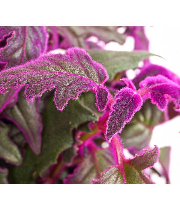 Wenn Sie Indonesien oder speziell die Inseln Java und Sulawesi schon bereist haben, konnten Sie die Gynure vielleicht schon in freier Natur bewundern. Sie wächst dort als Halbstrauch mit überhängenden Trieben und zählt zur Familie der Korbblütler, ist somit weitschichtig mit den Chrysanthemen verwandt. Ins Auge fällt die Samtpflanze wegen ihrer besonders exotischen Optik: sie hat große, gezähnte Blätter, die überzogen sind mit einem feinen Flaum in leuchtendem Violett. Im späten Herbst oder im Frühjahr kann die Zimmerpflanze orangefarbene Blüten bekommen. Das ist ein weiterer extravaganter Blickfang, denn durch die violette Blattrandung sticht das helle Orange besonders heraus. Doch der Duft den die Blüten verbreiten ist nicht jedermanns Geschmack, notfalls sollten Sie diese noch vor dem Öffnen abknipsen.