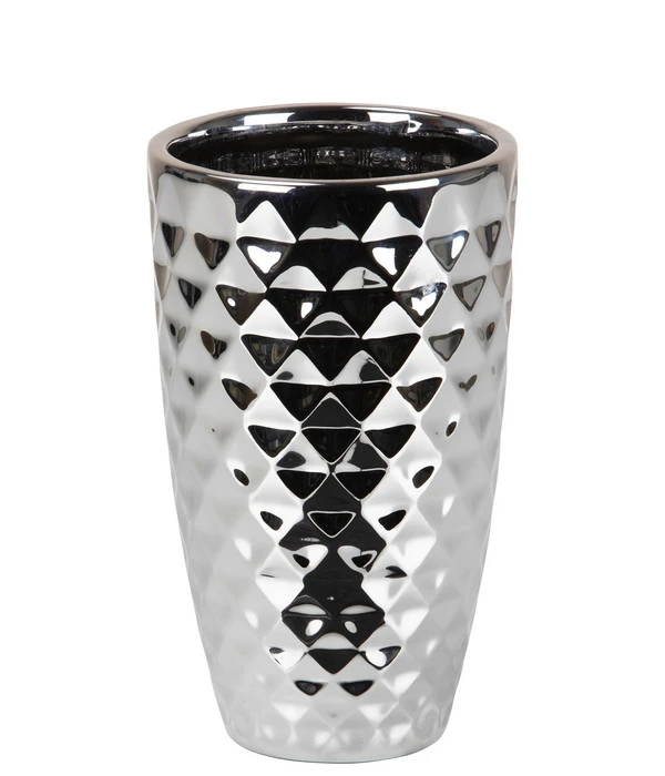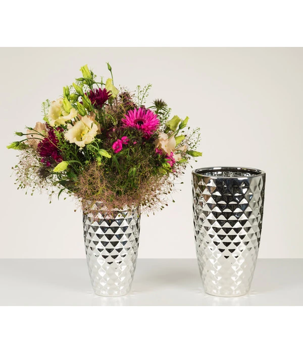 Sie lieben es, Ihr Zuhause immer wieder mit frischen Blumen zu verschönern? Dann können Sie die dekorativen Wirkung der Pflanzen mit der modischen Keramik-Vase Mirror Silver von Scheurich perfekt abrunden. Das elegante Gefäß überzeugt durch eine markante Diamant-Struktur und seine auffällige, trendige Oberfläche. Mit dem Aluminiumfinish erhält das Accessoire einen Spiegeleffekt, der nicht nur Sie, sondern bestimmt auch Ihre Besucher begeistern wird. Für eine noch größere optische Wirkung in Ihrem Interieur platzieren Sie doch gleich zwei oder mehrere Modelle der Keramik-Vase Mirror Silver in Ihrem Zimmer! Oder Sie erwerben weitere Pflanzenbehälter von Scheurich und schmücken damit stilvoll Ihr Zuhause.
