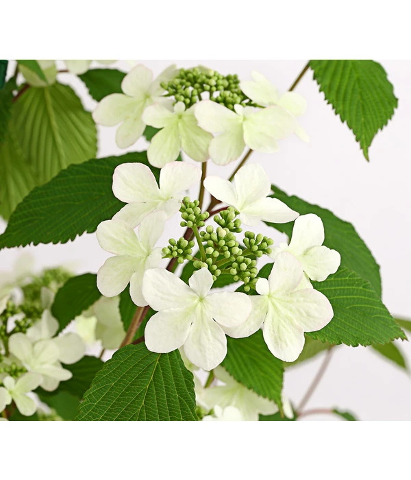 Was für ein faszinierendes Bild: Früh am Morgen erscheinen die ersten Sonnenstrahlen am Horizont und treffen auf den schneebedeckten Gipfel des Kilimandscharo, das höchste Bergmassiv des Afrikanischen Kontinents! Und wie das weithin sichtbare Gebirge sich aus der Ebene erhebt, wird auch bald in Ihrem Garten ein schneeweiß leuchtender Berg alle Blicke auf sich ziehen. Allerdings ist Ihr Kilimandscharo nicht mit Schnee bedeckt, sondern dicht an dicht mit prächtigen, weißen Tellerblüten besetzt, die wie von der Morgensonne beschienen mit einem leichten Rosa-Ton überhaucht sind. Und weil der Schneeball ‘Kilimandjaro Sunrise‘ einen aufrechten und dabei leicht pyramidenförmigen Wuchs zeigt, ist der Eindruck eines spektakulären Berges perfekt. Holen Sie sich den Schneeball ‘Kilimandjaro Sunrise‘ in Ihren Garten und erleben Sie den Gipfel des Gärtner-Glücks! Denn nicht nur zur Blütezeit im Mai und Juni ist das Ziergehölz ein fantastischer Gartenschmuck. Im Hochsommer zeigt er feuerrote Beeren, die einen tollen Kontrast zu der zweiten Blüte bilden, und im Herbst lässt er sein Laub in einem prächtigen Dunkelrot leuchten.