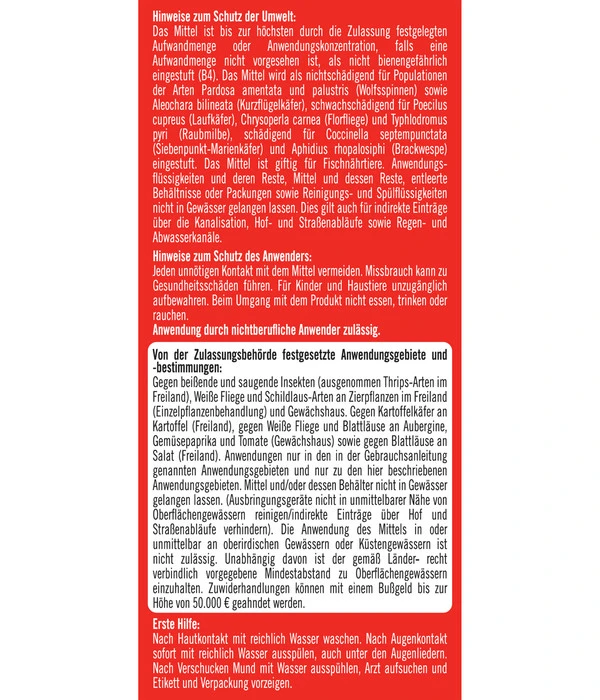 Substral® Celaflor® Schädlingsfrei Careo® kann im Haus oder Wintergarten ganzjährig angewendet werden, im Freiland nur in der Zeit zwischen März und November. Empfohlen werden maximal 3 Anwendungen pro Jahr. Bei wiederholten Anwendungen mit Substral® Celaflor® Schädlingsfrei Careo® oder Mitteln derselben Wirkstoffgruppe können Wirkungsminderungen eintreten. Um Resistenzbildung vorzubeugen, sollten Sie das Mittel möglichst im Wechsel mit anderen Wirkstoffen und Wirkstoffgruppen verwenden. Lösen Sie 10 ml in einen Liter Wasser auf und spritzen Sie es gleichmäßig auf die Pflanzen. Das Konzentrat ist in der Regel gut pflanzenverträglich. Da bei der großen Anzahl der Pflanzenarten und -sorten unterschiedliche Verträglichkeiten auftreten können, empfiehlt es sich, vor der Spritzung des gesamten Bestands die Empfindlichkeit einzelner Pflanzen zu prüfen und über einen Zeitraum von ca. 10 Tagen zu beobachten. Noch ein Hinweis: Vermeiden Sie die Anwendung von Substral® Celaflor® Schädlingsfrei Careo® bei hohen Temperaturen, also über 25°C oder bei direkter Sonneneinstrahlung.
