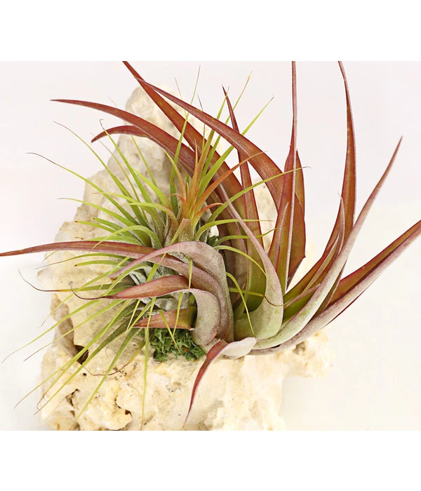 Ursprünglich sind diese außergewöhnlichen Pflanzen in den tropischen Regionen Mittel- und Südamerikas zu Hause, wo sie an den ungewöhnlichsten Orten wachsen: in Felsenspalten, auf Mauern und Bäumen. Also überall dort, wo eine ‚normale‘ Pflanze kläglich verkümmern würde. Aber Tillandsien sind Pflanzen, die sich Nährstoffe und Wasser nicht über die Wurzeln aus der Erde holen. Vielmehr haben sie ein raffiniertes System entwickelt, um die benötigten Stoffe über Blattschuppen aus der Luft holen. Auf diese Weise fügen sie zu ihrer extravaganten Optik auch noch die Eigenschaft ‚absolut pflegeleicht‘ hinzu, was ihre Beliebtheit bei den Fans exotischer Pflanzen noch steigert. Hier wurden zwei Tillandsien auf einem Sansibar Rock arrangiert und bilden ein Deko-Objekt von faszinierender Ausdruckskraft! Der Sansibar Rock ist ein reiner Naturstein, der vor allem mit den bizarren Auswaschungen begeistert und perfekt zu den interessanten Wuchsformen der zwei Tillandsien-Arten passt. Und wie für die Tillandsien, gilt auch für den Sansibar Rock: kein Stein gleicht dem anderen, jedes Pflanz-Exemplar ist ein unverwechselbares Unikat.