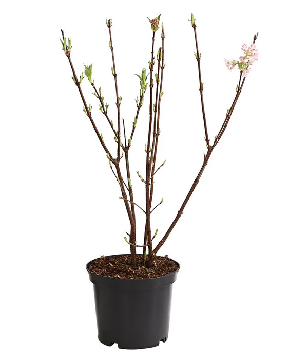 Wer einen Zierstrauch wie den Winter-Schneeball ’Dawn’ zu sich in den Garten einlädt, wird diese Entscheidung nie bereuen. Denn dieser Blühstrauch wird das Ensemble Ihrer Gartenpflanzen um mehr als eine Facette bereichern. Da ist erst einmal der ungewöhnliche Blütezeitpunkt. In der Regel präsentiert er seine prächtigen, roséfarbenen Blütenrispen von Februar bis April. Manchmal überrascht er uns aber schon im November und Dezember mit seinem Blütenflor, der den Garten außerdem mit einem intensiven, sehr angenehmen Duft erfüllt. Da es sich bei dem Winter-Schneeball ’Dawn’ um ein sommergrünes Ziergehölz handelt, lenken keine Blätter von dem Blütenmeer ab und blühende Konkurrenz ist im kargen, winterlichen Garten auch nicht zu befürchten. Den Sommer über zeigt sich der aufrechte, dichtbuschige Strauch im Schmuck sein dunkelgrünen, lanzettlichen Blätter bis er sich im Herbst mit einer prächtigen Laubfärbung in Rot bis Dunkelviolett erneut energisch in den Blickpunkt rückt.