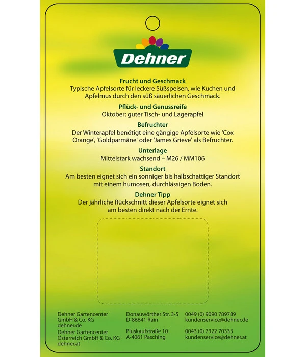 Bei diesem Apfelbaum ist darauf zu achten, ihn an einen sonnigen bis halbschattigen Standort zu pflanzen. Die Erde soll humos und durchlässig sein. Die Pflanze sollte am Anfang regelmäßige Wassergaben bekommen, damit sie gut anwachsen kann. Außerdem wird ein Stützpfahl benötigt, um das Umfallen bei Sturm zu vermeiden. Sie sollten den Obstbaum einmal im Jahr mit Obstbaumdünger düngen, denn nur so werden die wichtigen Nährstoffe angeboten. Es handelt sich um eine selbststerile Pflanze, weswegen Befruchtersorten benötigt werden. Hierfür eignen sich zum Beispiel: ‚Golden Delicious‘, ‚Klarapfel‘ oder ‚James Grieve‘.