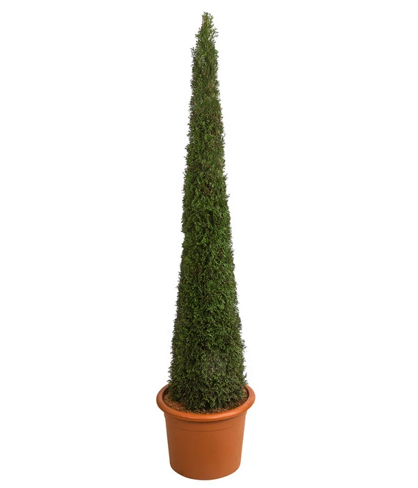 Schlank und elegant reckt er sich in die Höhe und bildet mit seinem smaragdgrün leuchtenden Nadelkleid das ganze Jahr einen prachtvollen Blickfang. Kein Wunder, dass uns der XXL-Lebensbaum ‘Smaragd‘ Torwächter an die ähnlich aussehenden Zypressen erinnert, die im Mittelmeerraum die Einfahrten zu herrschaftlichen Landsitzen flankieren oder in den ausgedehnten Gärten als grüne Landmarken dienen. Dank des extrem aufrechten, schlanken Wuchses müssen Sie aber über keinen parkähnlichen Garten verfügen, um diesen Lebensbaum bei sich begrüßen zu können. Denn auch wenn er im Alter eine stattliche Höhe von 400-600 cm erreichen kann, wird er dabei aber nicht sehr breit. Vielmehr behält der stattliche Großstrauch bis ins hohe Alter seinen schlanken, leicht pyramidalen Wuchs, der im Grunde genommen auch keinen Schnitt braucht. Ob am Hauseingang, neben der Terrasse oder an der Einfahrt zum Grundstück – akzentuieren Sie die Stelle mit dem XXL-Lebensbaum ‘Smaragd‘ Torwächter!