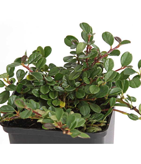 Manche Fans der Zwergmispel ‚Frieders Evergreen‘ können sich nicht entscheiden, was ihnen besser gefällt: wenn im Frühjahr zwischen dem dunkelgrün glänzenden Laub die vielen kleinen, strahlend weißen Blütensterne leuchten oder wenn im Spätsommer die roten Beeren erscheinen und bis in den Winter einen dekorativen Kontrast zu dem dunklen Laub bilden. Und noch eine Besonderheit zeichnet den Zwergstrauch aus: Obwohl er immergrün ist, sorgt er im Herbst wie die laubabwerfenden Gehölze für optische Abwechslung und präsentiert sich ebenfalls mit einer schönen orange-roten Laubfärbung. Diese Cotoneaster-Art ist also zu jeder Jahreszeit ein attraktiver Bodendecker im Garten, der sich schnell ausbreitet und Unkrautwuchs wirkungsvoll unterdrückt. Da er sich mit langen Trieben am Boden ausbreitet und sich nur bis 15 – 20 cm in die Höhe reckt, ist die Zwergmispel der ideale Bodendecker auch für kleine Beete, Grabbepflanzungen und Gärten.